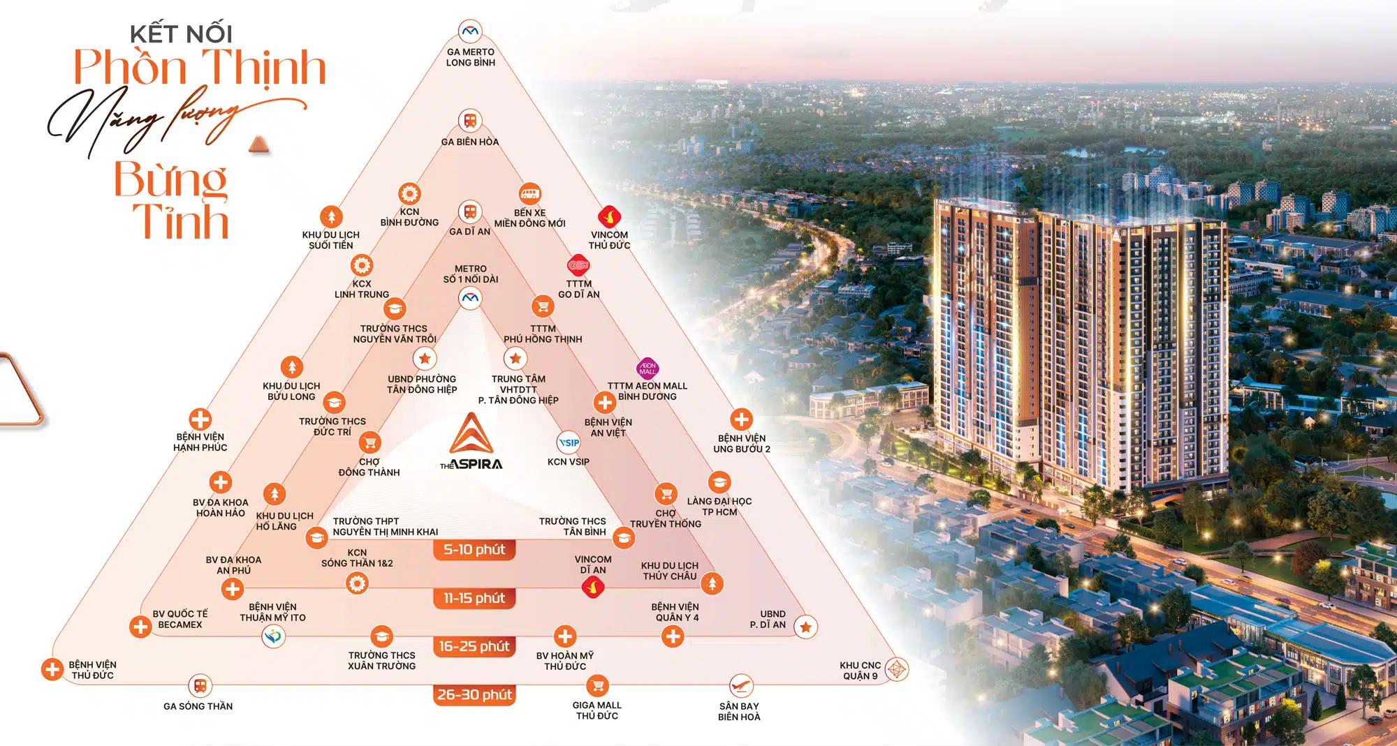 Thừa hưởng nhiều lợi thế khi kề cận các trục giao thông huyết mạch như Quốc lộ 1K, Cao tốc Chơn Thành – TP. HCM (DT 743B), Mỹ Phước – Tân Vạn và đặc biệt với tuyến Metro ngay bên thềm nhà, The Aspira kiến tạo nên “tọa độ năng lượng” liên kết đa vùng kinh tế, dòng chảy giao thương phồn thịnh. Nơi mọi nhịp chuyển động của thành phố, tâm điểm đầu tư, thương mại, dịch vụ đều hội tụ và lan tỏa, mở ra một hành trình kết nối thịnh vượng không giới hạn cho cộng đồng cư dân hiện đại, năng động.